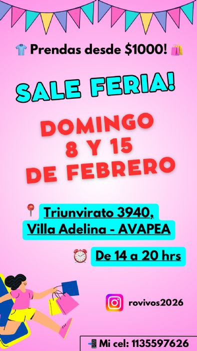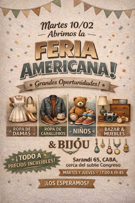 Ropa usada en buen estado. Algunas cosas nuevas. Para mujeres niños hombres. Ropa de invierno y verano. Gran variedad. Hay libros y objetos de la casa. Muy buenos precios. La feria se lleva a cabo todos los meses.